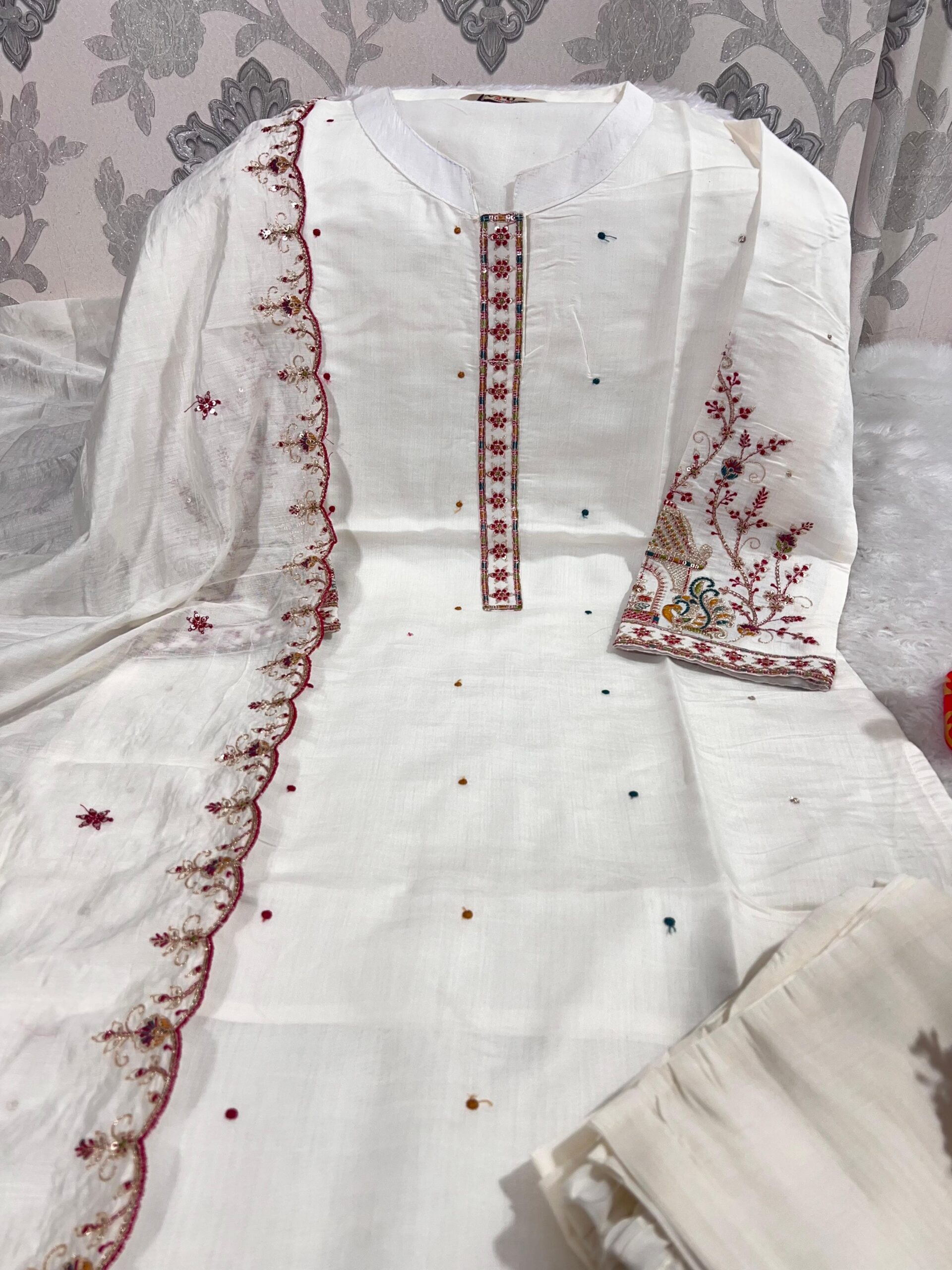 Heavy Embroidery Thread & Sequance work With Stand Patti Neck Also Traditional Mor Work On Sleeves