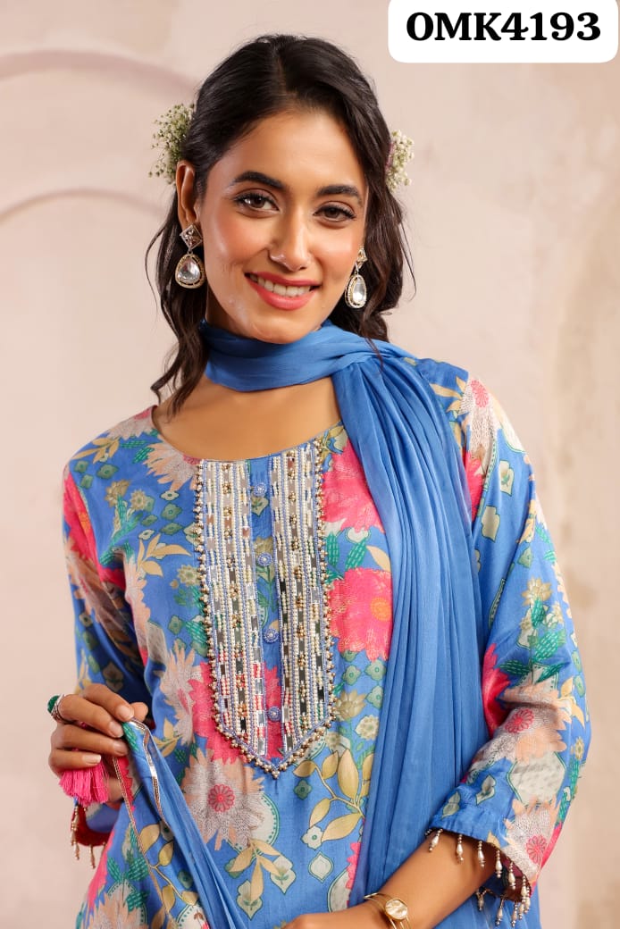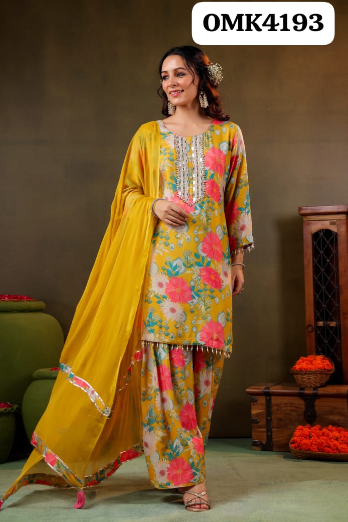 Beautiful Three Piece Digital Designer Floral Print Full Sleeves Pure Chinnon Full Flair Anarkali Kurti Set With Beautiful Embroidery & Gota Detailing on Yoke, Cuffs & Hemline Paired With Digital Designer Floral Print Pure Chinnon Sharara With Embroidery & Gota Detailing & Pure Chinnon Dupatta With Gota Detailing & Border